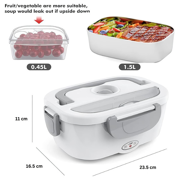 Táto vyhrievaná nádoba na obed obsahuje dve odnímateľné 1,5 l nádoby a 0,45 l plastovú nádobu, ktoré sa dajú používať striedavo.
